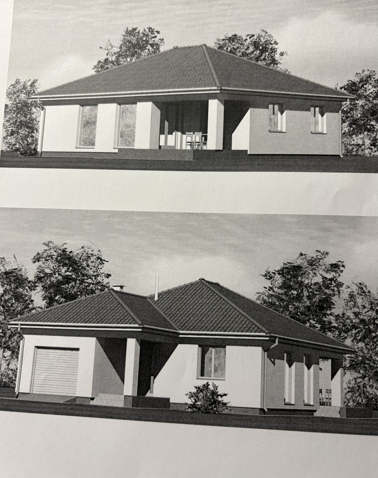 - Elosztása: Fedett bejáró, szélfogó, garázs, kazánház, nappali+konyha+étkező, WC/Fürdőszoba, 2 szoba ( külön nyílóak), 2 db. terasz. Az építkezés 2025-ben kezdődött el. A családi ház nettó alapterülete 104 nm. ( garázzsal együtt ).