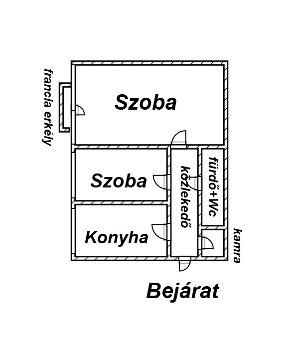 - Elosztása: közlekedő, 1+1 szoba ( külön nyílóak ) , konyha, fürdőszoba+ Wc (egy helyiségben van ), francia erkély.